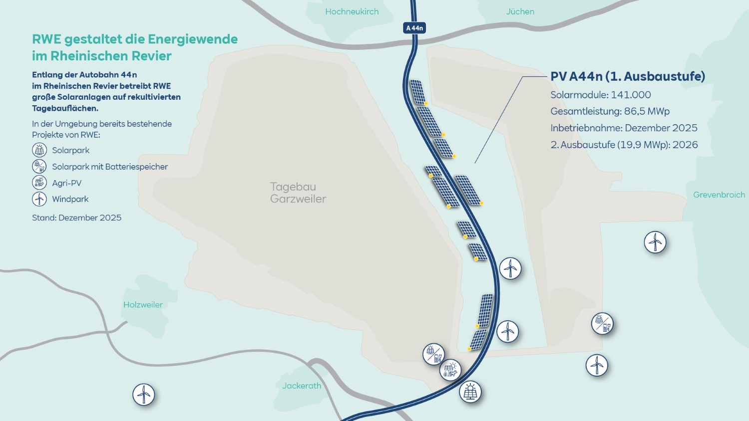 Die Solarparks erstrecken sich westlich und östlich der Autobahn zwischen den Städten Bedburg (Rhein-Erft-Kreis) und Jüchen (Rhein-Kreis Neuss) auf rekultiviertem Gelände des Tagebaus Garzweiler. „Die Inbetriebnahme der Solaranlagen an der A44n unterstreicht, wie konsequent wir den Ausbau unseres Solarportfolios vorantreiben. Im kommenden Jahr werden wir das Projekt erweitern“, sagte Katja Wünschel, CEO RWE Renewables Europe & Australia.
