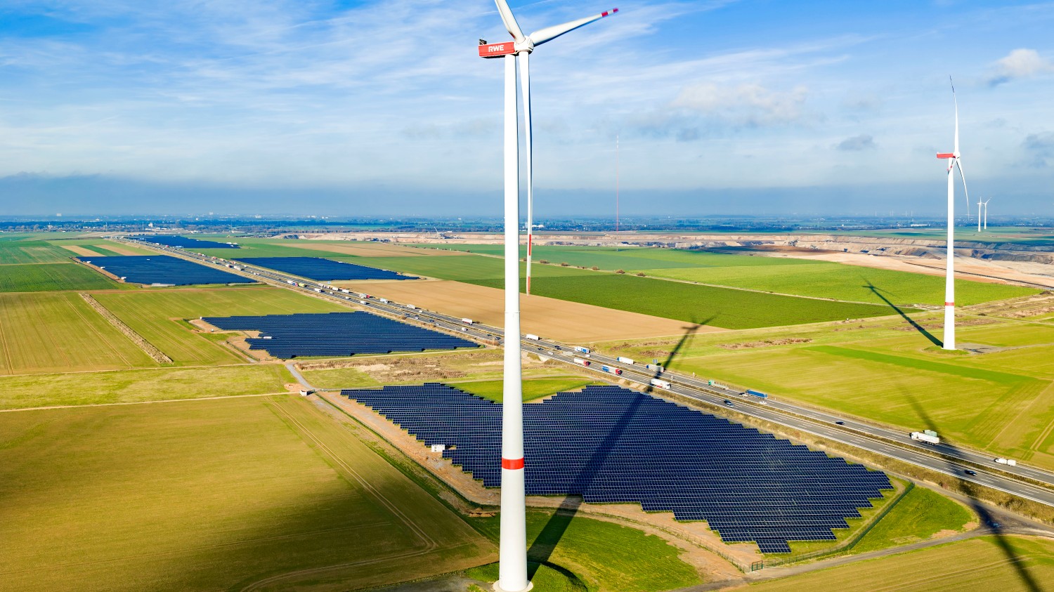 Neben Solarprojekten baut RWE in unmittelbarer Nähe den Windpark Bedburg 3 mit neun Anlagen und einer Leistung von rund 60 MW. Insgesamt betreibt das Unternehmen im Rheinischen Revier Solar- und Windprojekte mit 540 MW.